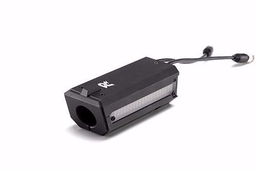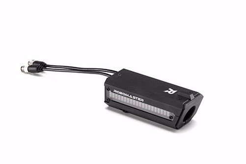 RoboMaster测速模块内置传感器,可实时测量枪管处所经过的弹丸速度及频率。其CAN接口(即航空线接头)根据裁判系统通信协议,将获取的弹丸的射速和射频数据实时发送给裁判系统主控模块。当测速模块检测到弹丸经过时,LED灯将会点亮进行提示,增加比赛的趣味性。