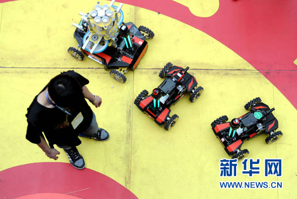 记者在哈尔滨工程大学6日举行的RoboMasters2015全国机器人大赛上看到,一个个“汽车人”造型的机器人在高度仿真的战争地形中激烈“交战”,上演一场智能机器人对抗的精彩视觉盛宴。