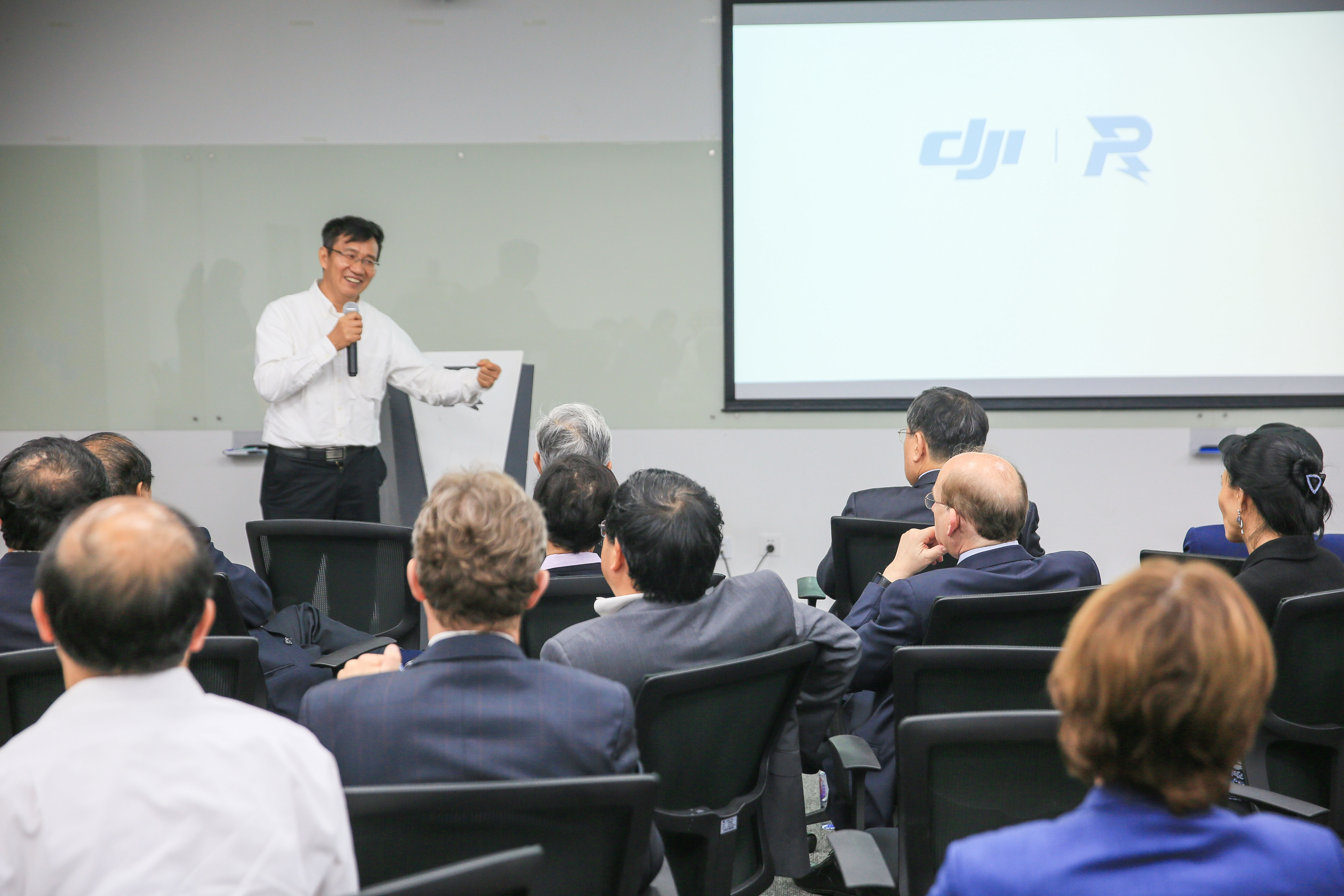 大疆创新企业战略总监 张晓楠 向到访的12位来自世界顶尖高校的委员会成员介绍了RoboMaster发展历程,并一同观看RoboMaster比赛的动态展示,部分嘉宾还上手体验了RoboMaster的对战操作,感受RoboMaster赛事文化。