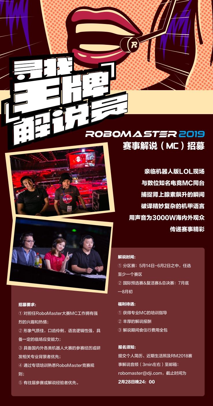 即日起至2019年2月28日24:00(北京时间)提交近期生活照、个人简历、3min左右模拟解说音频文件(比赛视频链接:http://v.qq.com/vplus/robomasters/videos)到robomaster@dji.com。