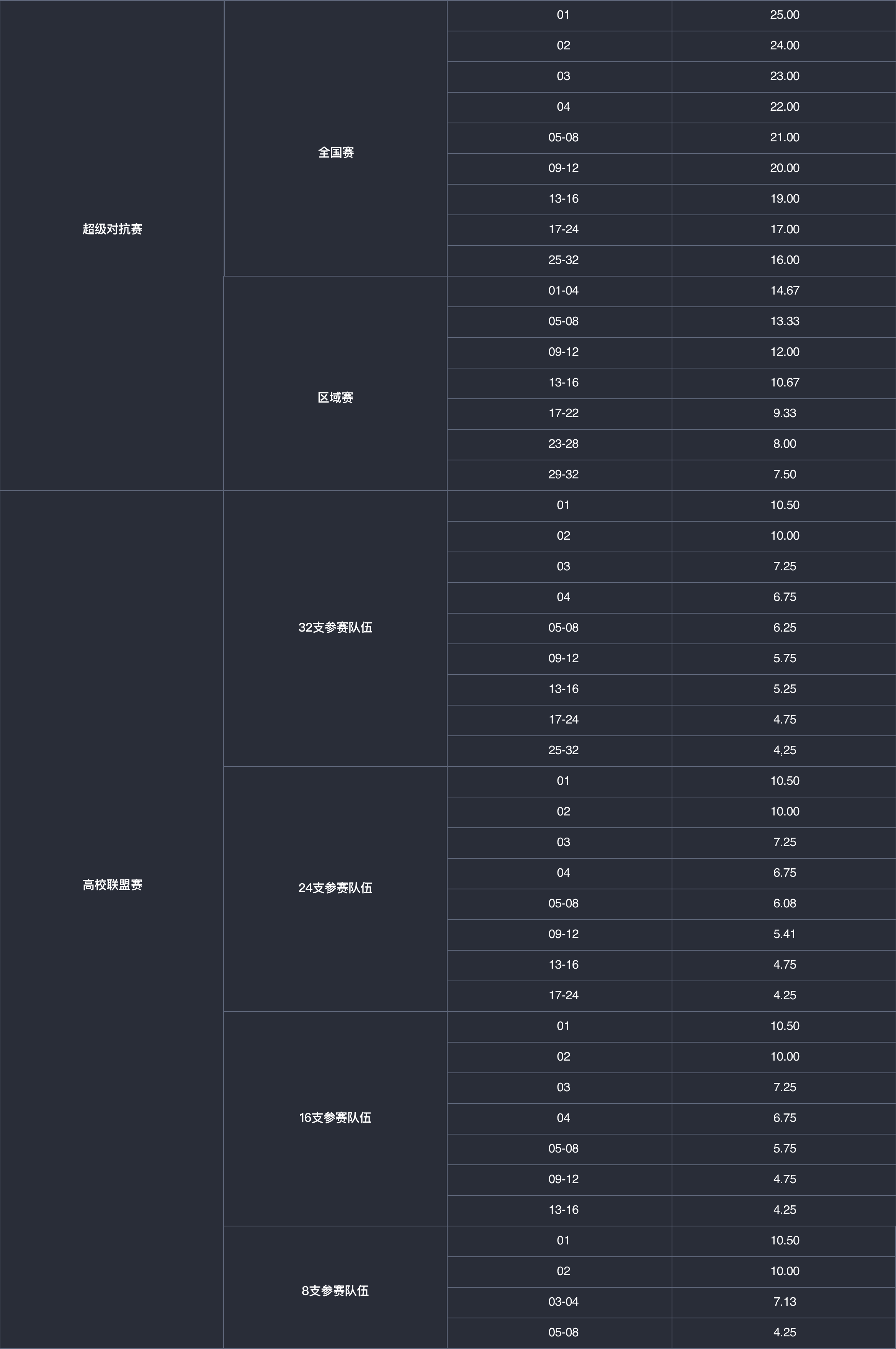 6、展示最终积分时,若存在数值位数超过小数点后两位,则四舍五入取小数点后两位,但实际排名以原数值进行计算。若多所高校分数相同,则排名相同;在需要决出准确排名时,优先比较各赛季积分,最近赛季积分高者排名靠前;若三个赛季积分均相等,则以最近一个赛季有效积分的所有参赛局次的平均基地净胜血量进行排名,平均基地净胜血量高者排名靠前。